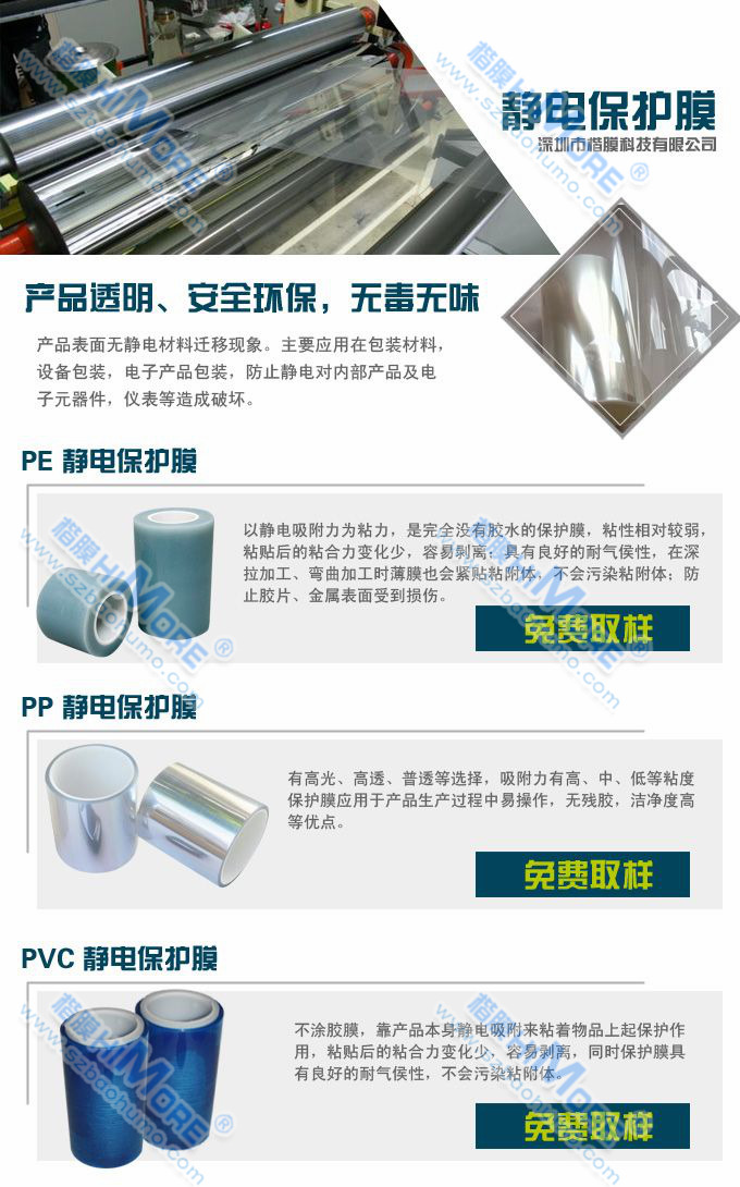 高透、吸附效果好,產(chǎn)品表面無靜電材料遷移現(xiàn)象,采用十萬級凈化車間生產(chǎn),潔凈度極優(yōu),透明度優(yōu)良,可以在貼合保護(hù)材料的狀態(tài)下進(jìn)行光學(xué)膜的外觀檢查,低粘性,貼附后粘著力經(jīng)時變化小,環(huán)保無毒無味的新興材料。