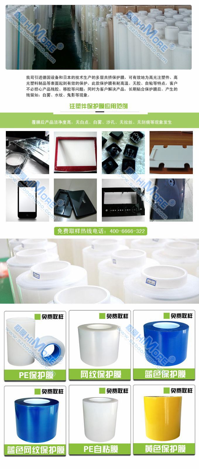 我司引進德國設(shè)備和日本的技術(shù)生產(chǎn)的多層共擠保護膜,可有效地為高光注塑件、高光塑料制品等表面起到有效的保護。此款保護膜有耐高溫、無膠、自粘等特點,客戶不必擔(dān)心產(chǎn)品殘膠、移膠等問題;同時為客戶解決產(chǎn)品,長期貼合保護膜后,產(chǎn)生的殘留如:白霧、水紋、鬼影等現(xiàn)象。